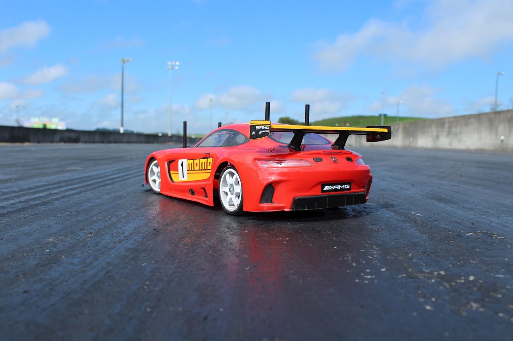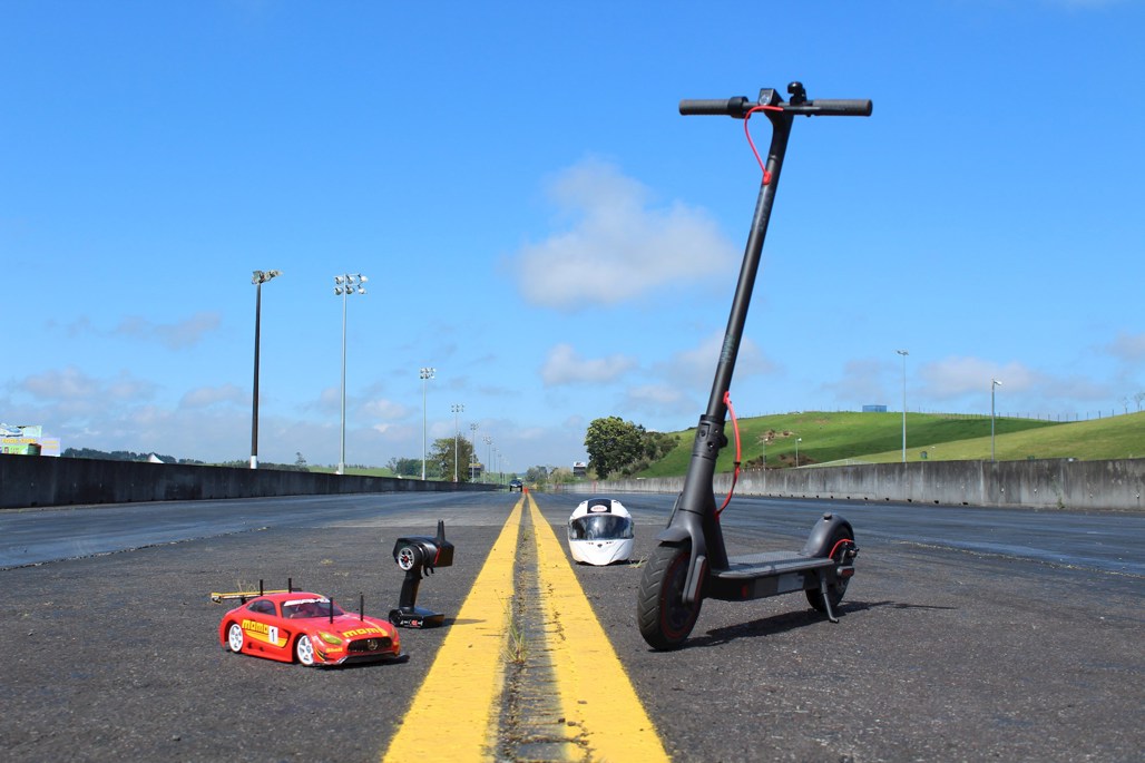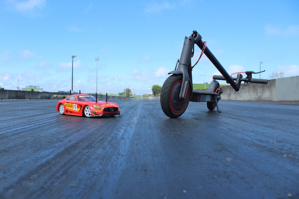 But while it may frequently win the CBD rush-hour races, it’s hardly fair to race an eScooter against a car, so we brought out an electric radio-control car, a Tamiya TT02 Mercedes-AMG GT, a popular “one-make” class in NZ RC car racing.