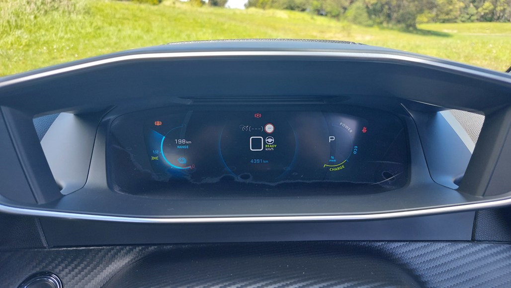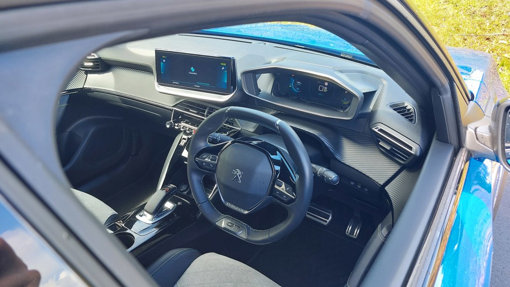 On the inside, it’s almost impossible to distinguish this electric Peugeot from the regular petrol-powered version. Highlights include the Alcantara-covered sports seats up front, and the 3D i-Cockpit behind the small steering wheel.
