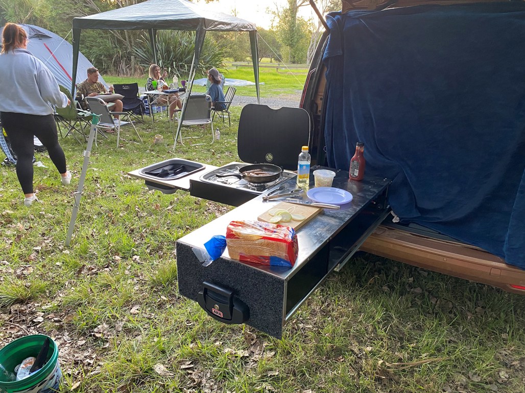 To the left of this is where you’ll find the (optional) pull-out kitchenette, which is something that I can’t recommend enough. Built in New Zealand by ARB, this unit provides a large stainless steel bench top, a three-burner gas cooker, a storage drawer, and a sink. The cooker is powered by a regular 9kg gas bottle, and I can attest that I was the talk of the campground when I fired it up for the first time.