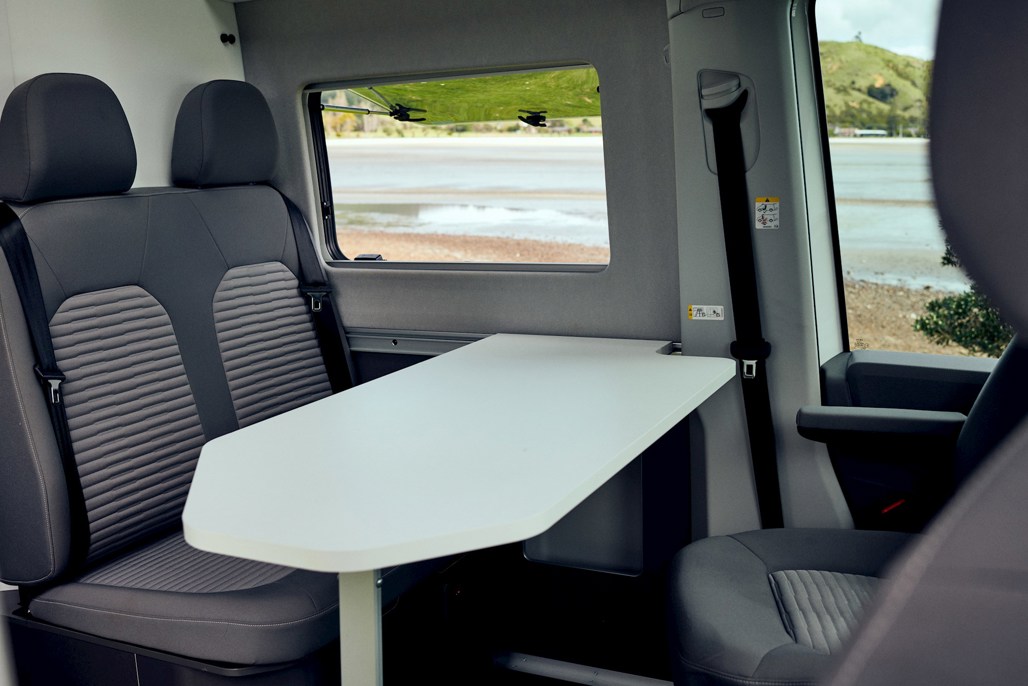 Picnic time. Or perhaps California surprise-and-delight time. The exterior step folds out automatically as soon as you open the side door, and will stay that way once you enter and press the touchpad setting for Camping Mode. There’s a small dining table with two chairs and the driver/front passenger seats can be swiveled around for a four-place setting, in case you want to eat out of the sun. Or look at your laptop instead of the view (it happens, right?).