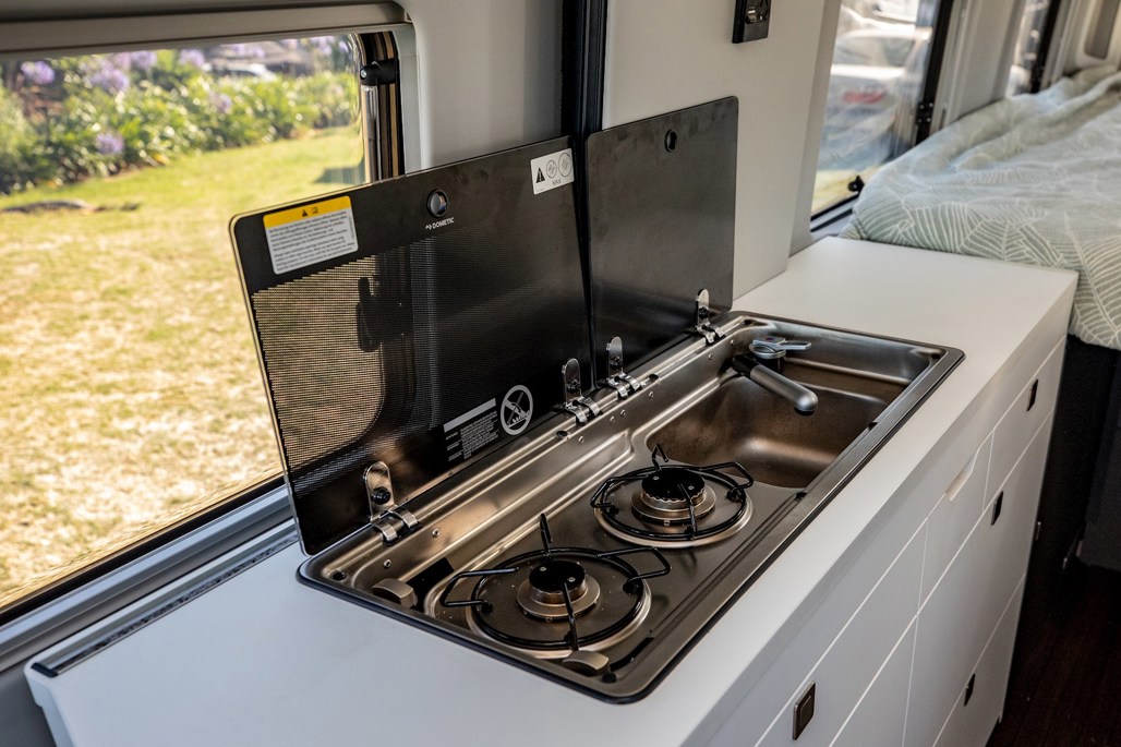 The kitchen is ultra-compact, but you get a gas cooker and sink all the same, and a decent run of flat benchspace for culinary creation. You can always spill (not literally) the prep onto the outdoor table, or fold the double bed away at the back and set up extra workspace there.