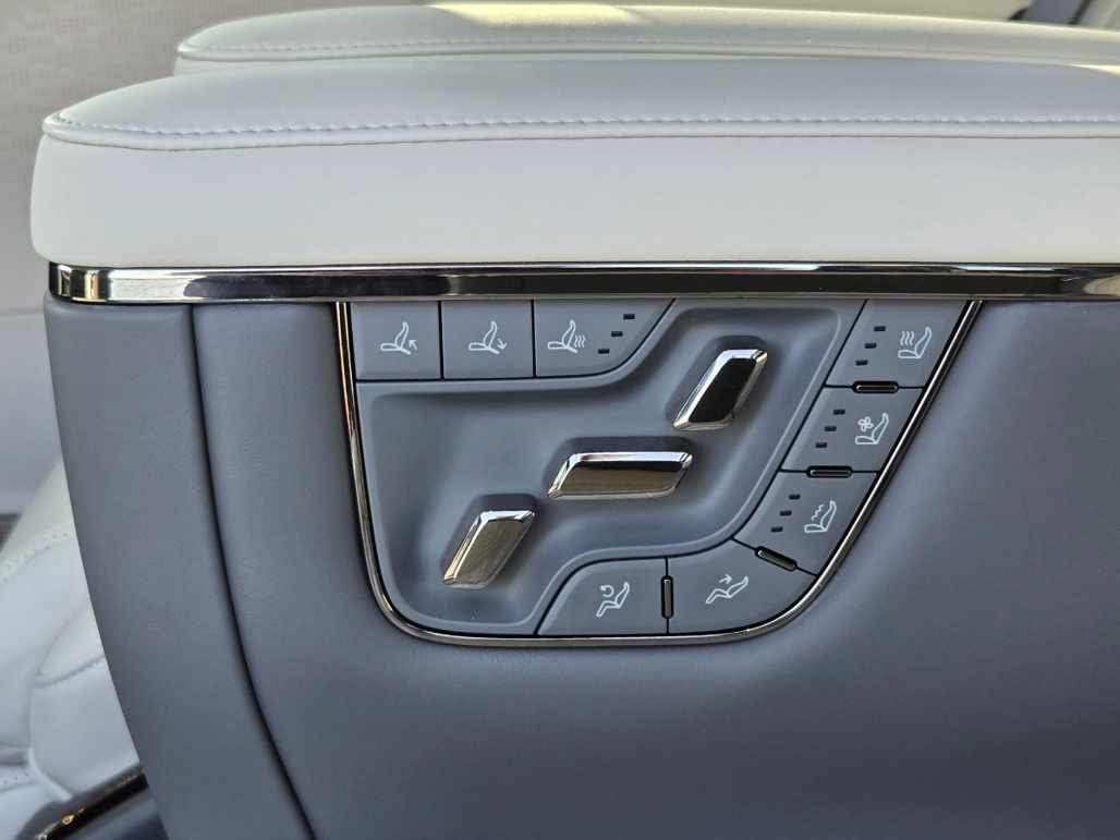 There’s a cooling and warming refrigerator for the back (remote-release) and a separate 17-inch screen that descends from the roof; the remote is nestled in a seat knook.