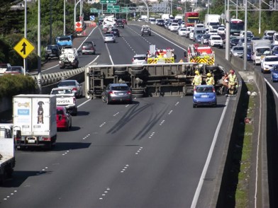 Icon T News Motorway mayhem after truck rolls near Auckland's Greenlane Motorway mayhem after truck rolls near Auckland's Greenlane